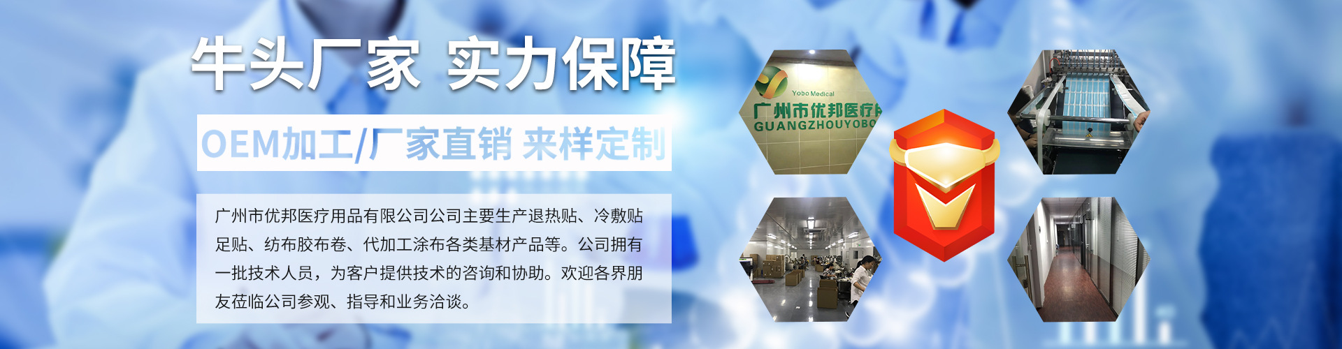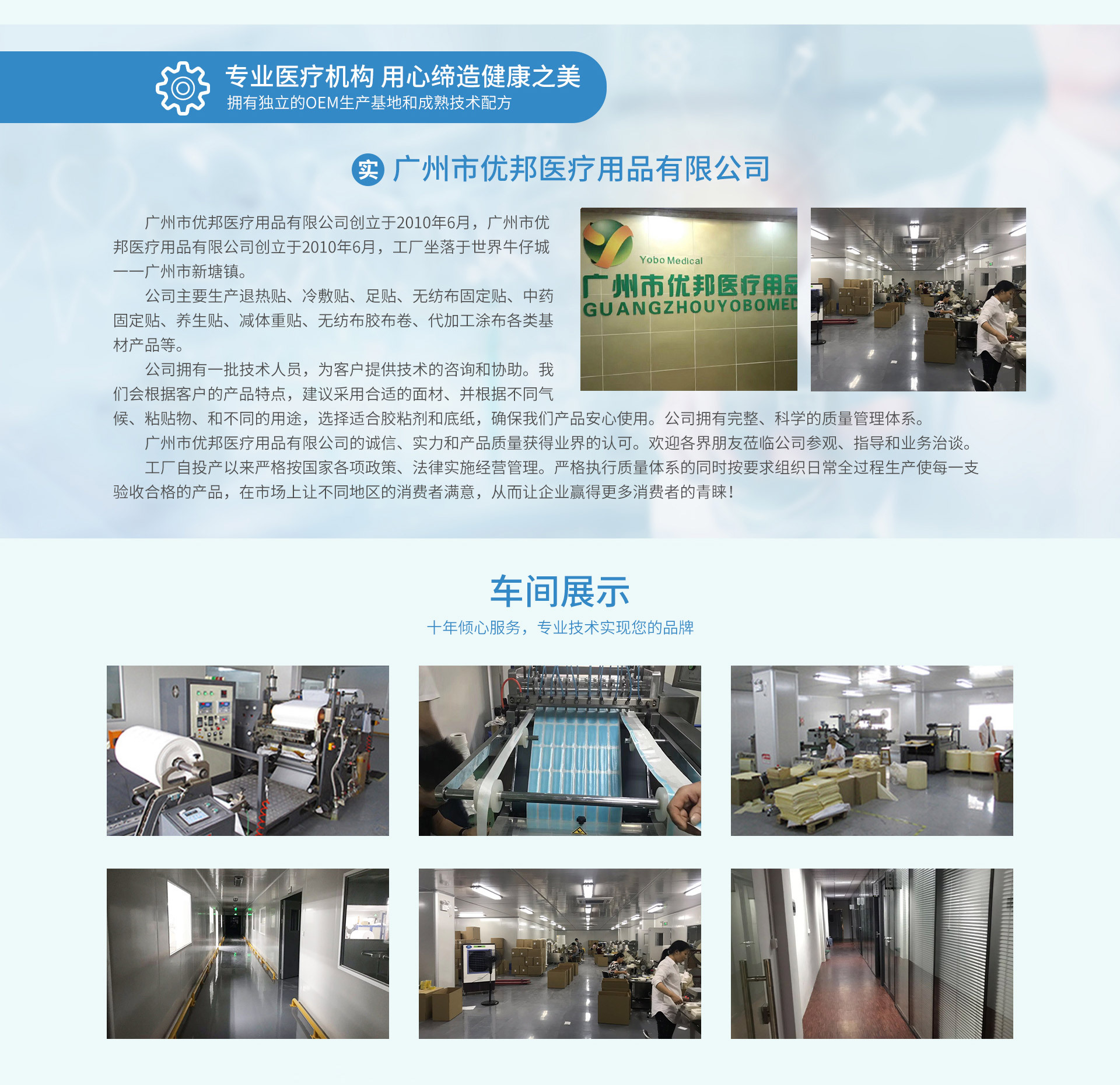 公司宗旨:诚信经营 以人为本 客户至上 公司口号:优邦医疗 用心缔造健康之美 公司指导思想:对客户负责 对员工负责 对团队负责 对社会负责 广州市优邦医疗用品有限公司创立于2010年6月,工厂坐落于世界牛仔城——广州市新塘镇。 公司主要生产退热贴、冷敷贴、足贴、无纺布固定贴、中药固定贴、养生贴、减肥贴、无纺布胶布卷、代加工涂布各类基材产品等。 公司拥有一批专业的技术人员,为客户提供技术的咨询和协助。我们会根据客户的产品特点,建议采用合适的面材、并根据不同气候、粘贴物、和不同的用途,选择适合胶粘剂和底纸,确保我们产品安全,并且完美。公司拥有完整、科学的质量管理体系。广州市优邦医疗用品有限公司的诚信、实力和产品质量获得业界的认可。欢迎各界朋友莅临公司参观、指导和业务洽谈。