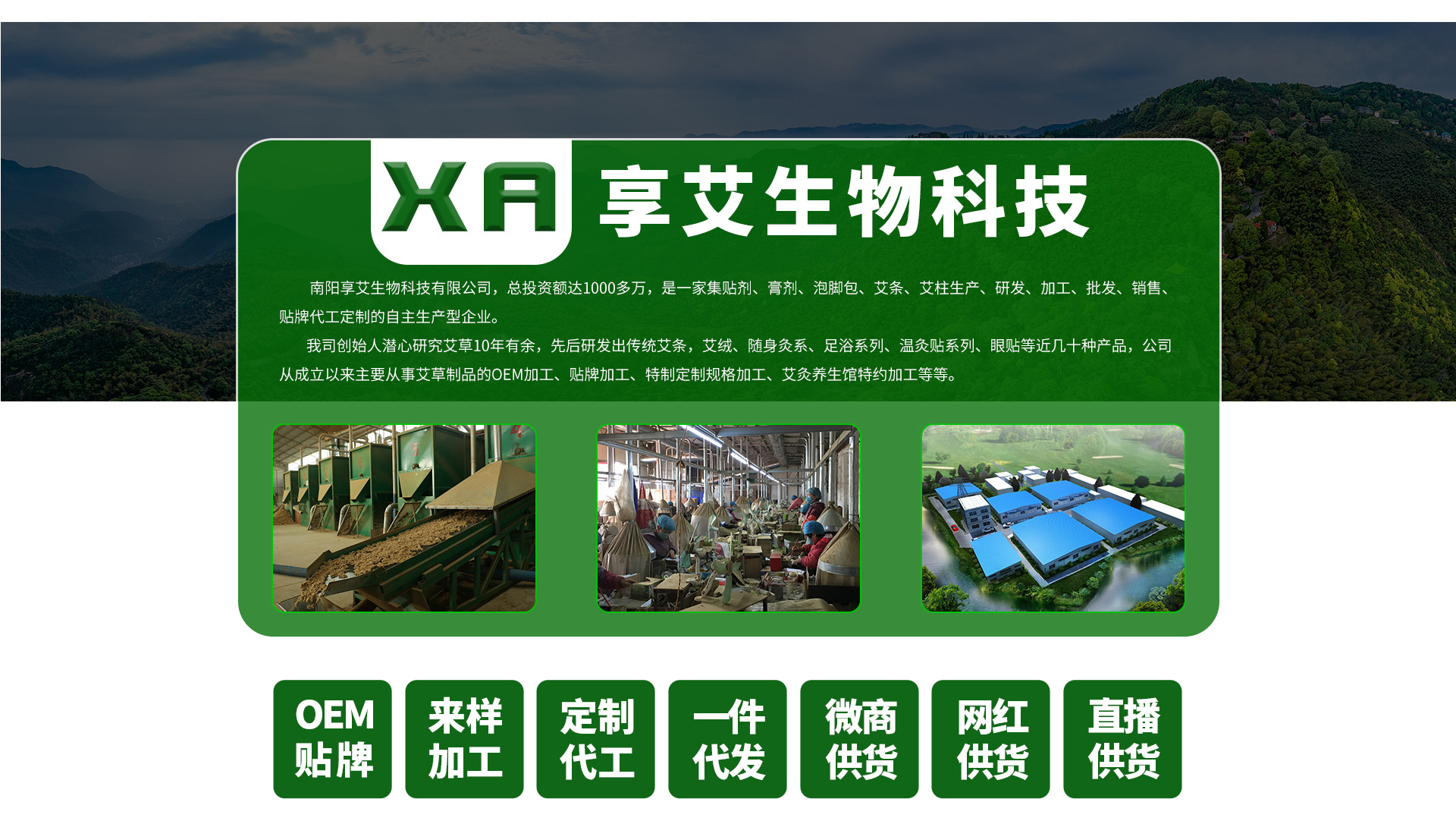 南阳享艾生物科技有限公司位于医圣(张仲景)故里,中草药都─河南•南阳,总投资额达1000多万,是一家集贴剂、膏剂、泡脚包、艾条、艾柱生产、研发、加工、批发、销售、贴牌代工定制的自主生产型企业;得天独厚的生态环境和丰富优质的野生艾草资源为公司生产的产品提供了非常优质的原材料。我公司拥有完整科学的质量管理体系,以雄厚的实力、合理的价格、优良的服务与多家企业建立了长期的合作关系。 我司创始人潜心研究艾草10年有余,先后研发出传统艾条,艾绒、随身灸系、足浴系列、温灸贴系列、眼贴等近几十种产品,公司从成立以来主要从事艾草制品的OEM加工、贴牌加工、特制定制规格加工、艾灸养生馆特约加工等等。将传统艾灸养生秘方与现代技术完美结合。同行弘扬古老的中医传统文化,传递健康,造福百姓。 南阳享艾生物科技有限公司有广泛的商品信息网络,合作伙伴遍及世界各地; 公司实力雄厚,重信用,守合同,保证产品质量,产品品质齐全,价格合理,为更多的艾制品代销商、批发商、贴牌制作客户提供更好更优质的产品和服务。以多品种经营特色和薄利多销的原则,赢得了广大客户的信任和依赖。