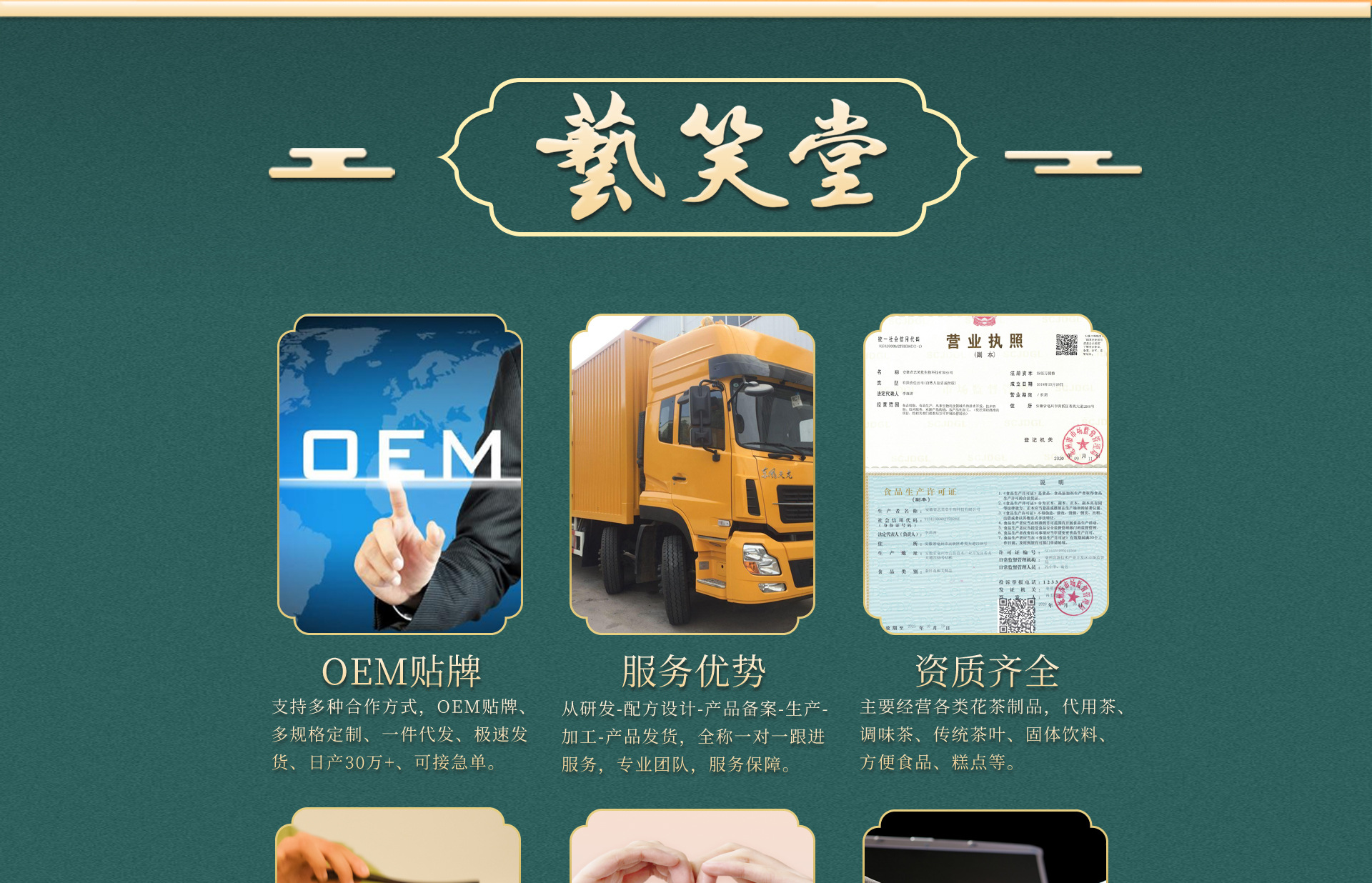 安徽省艺笑堂生物科技有限公司位于“四大药都之首”亳州,公司面积5000平方米。公司致力于各种花茶OEM代加工、药食同源、香料、食品等产品专业生产加工的公司 ,产品多种多样可OEM代加工、优质的产品质量。赢得了广大客户的青睐,订单纷至沓来。 安徽省艺笑堂生物科技有限公司主要生产花茶OEM代加工、药食同源、香料、食品等产品专业生产加工的公司,拥有完整、科学的质量管理体系、 畅销消费者市场,在消费者当中享有较高的地位,公司与多家零售商和代理商建立了长期稳定的合作关系。 我司以“质量第一、顾客至上”为宗旨,事事为客户着想。质优价廉。 严抓稳定的品质、合理的价格、适时的交期和热情的售后服务,是我司建厂到今的方针政策。热烈欢迎客户前来指导和参观。 我们公司还设有专门针对淘宝用户及零售服务小批量需求客户的专业厂家,欢迎各位领导与我们联系。 安徽省艺笑堂生物科技有限公司的诚信、实力和产品质量获得业界的认可