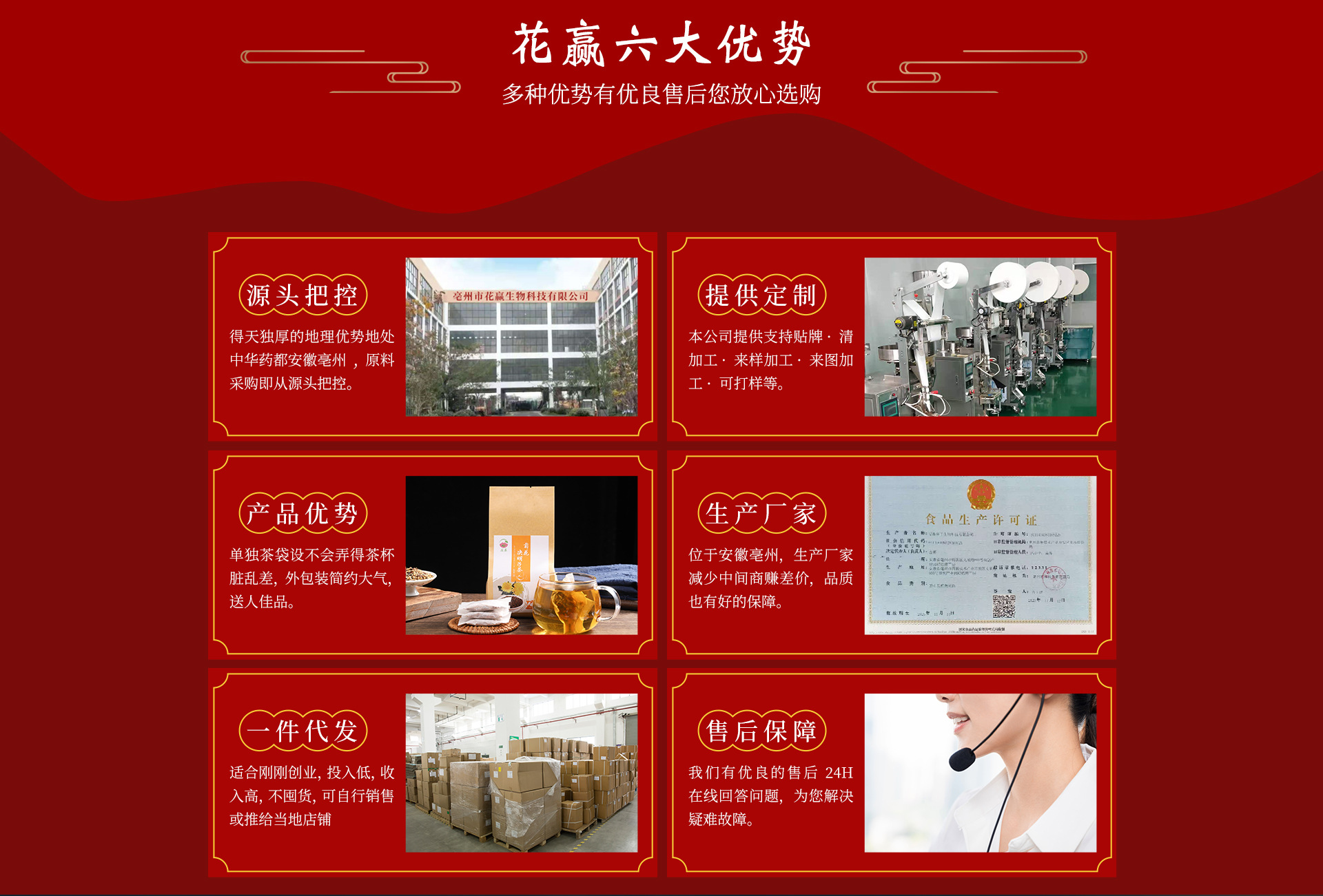 亳州市花赢生物科技有限公司是一家生产加工为一体的生产型企业,公司位于四大药都之首安徽-亳州,厂区环境优美、物流便捷,标准化SC生产车间,完善的质量管理体系,公司现有员工86人,其中研发人员3人,检验员3人,化验员2人,公司主营:代用茶、调味茶、组合花茶等,秉承:诚信经营、质量第一的原则取得广大客户的信赖与支持,亳州市花赢生物科技有限公司欢迎新老客户前来洽谈与指导。