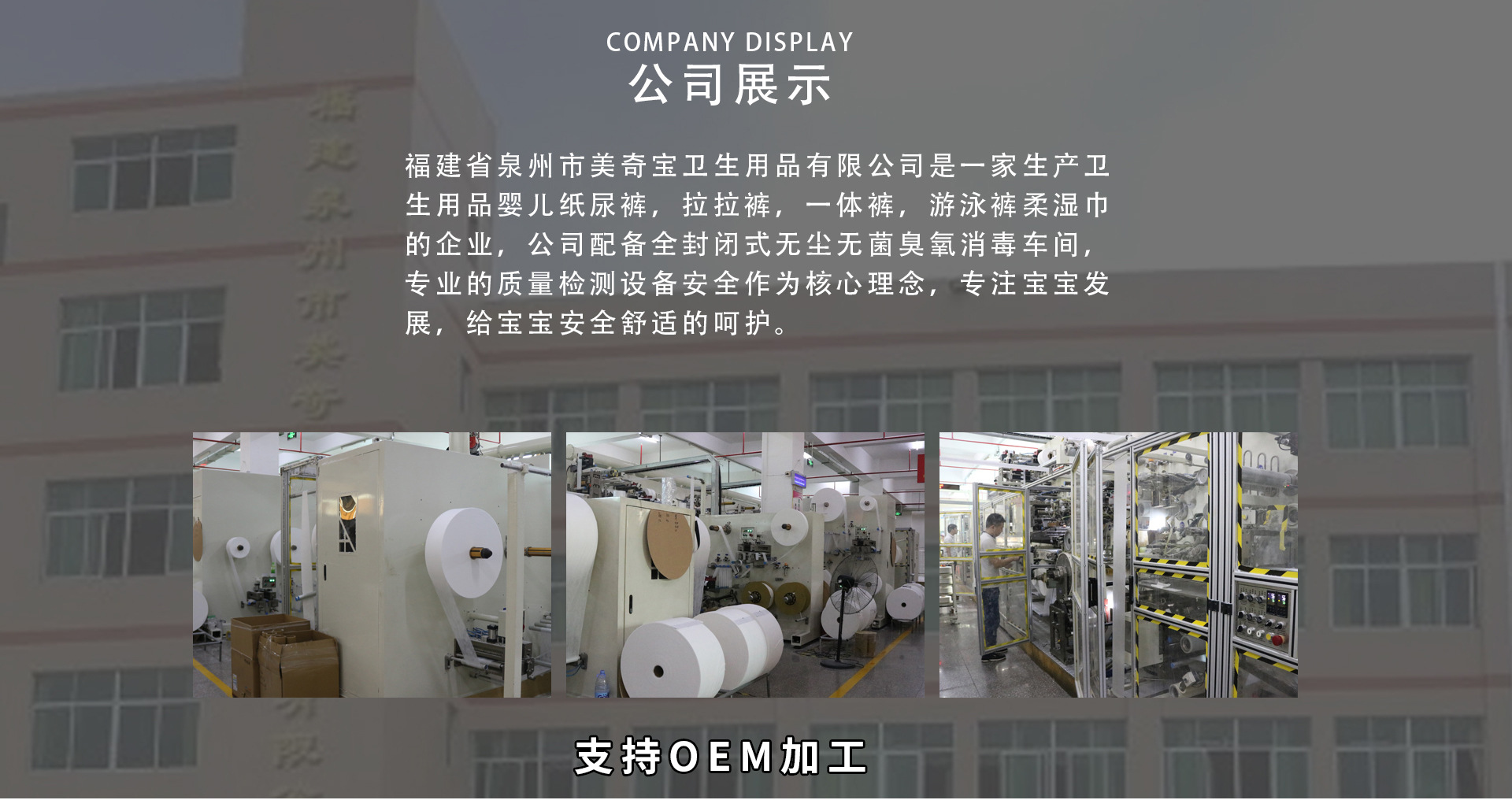泉州美奇宝卫生用品有限公司始创于2015年,系一家集研发、生产、销售、服务于一体的专业生产妇幼卫生用品的企业,目前员工100余人,生产线2条。公司已通过SGS、ISO9001:2008版国际质量管理体系认证,并引进德国先进的条码全程追朔系统,有效保证生产全过程处于严密的质量追踪和控制之中,深层次推进企业管理和变革,形成以管理创效益、以质量创发展的公司理念。 公司配备全封闭式无尘,无菌,臭氧消毒车间。2015年,公司引进两条超工艺生产设备,同时安装了金属检测仪、污点监测系统、红外线杀菌设备等多套专业的质量检测设备,建立起严谨、专业、规范的生产作业管控体系及智能化质量管理体系。 美奇宝公司自创立来,始终以、专注、创新、拼搏的企业精神不断开拓新的市场篇章。公司自营品牌"美奇宝""助乐宝""成长裤"等,产品覆盖全国各个地区,未来,美奇宝公司将以更,更具影响力的企业战略市场新高度.
