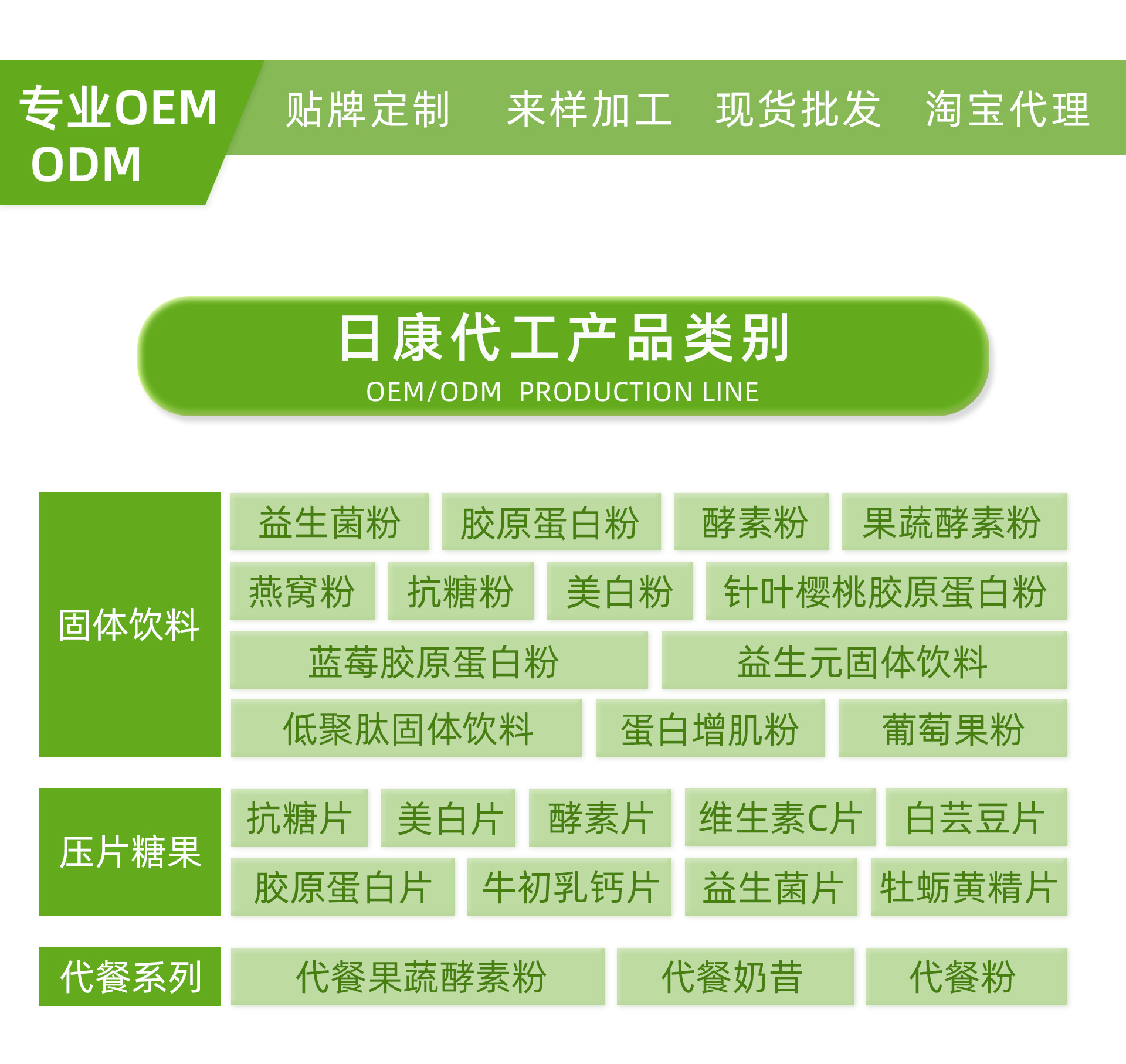 广州日康保健食品实业有限公司是一家生物药物保健技术研究、生产、销售、于一体的高新企业,主营保健食品、保健食品原料、保健食品代工、片剂代工、粉剂代工等。公司有很好的学术研究气氛围及先进的信息网络,与国内外多家生物医药研究所共同打造以专业为后盾的健康美的平台,所研制的功能性保健品一直处于国际领先地位。  公司秉承“顾客至上,锐意进取”的经营理念,坚持“客户第一”的原则为广大客户提供优质的服务。欢迎惠顾!