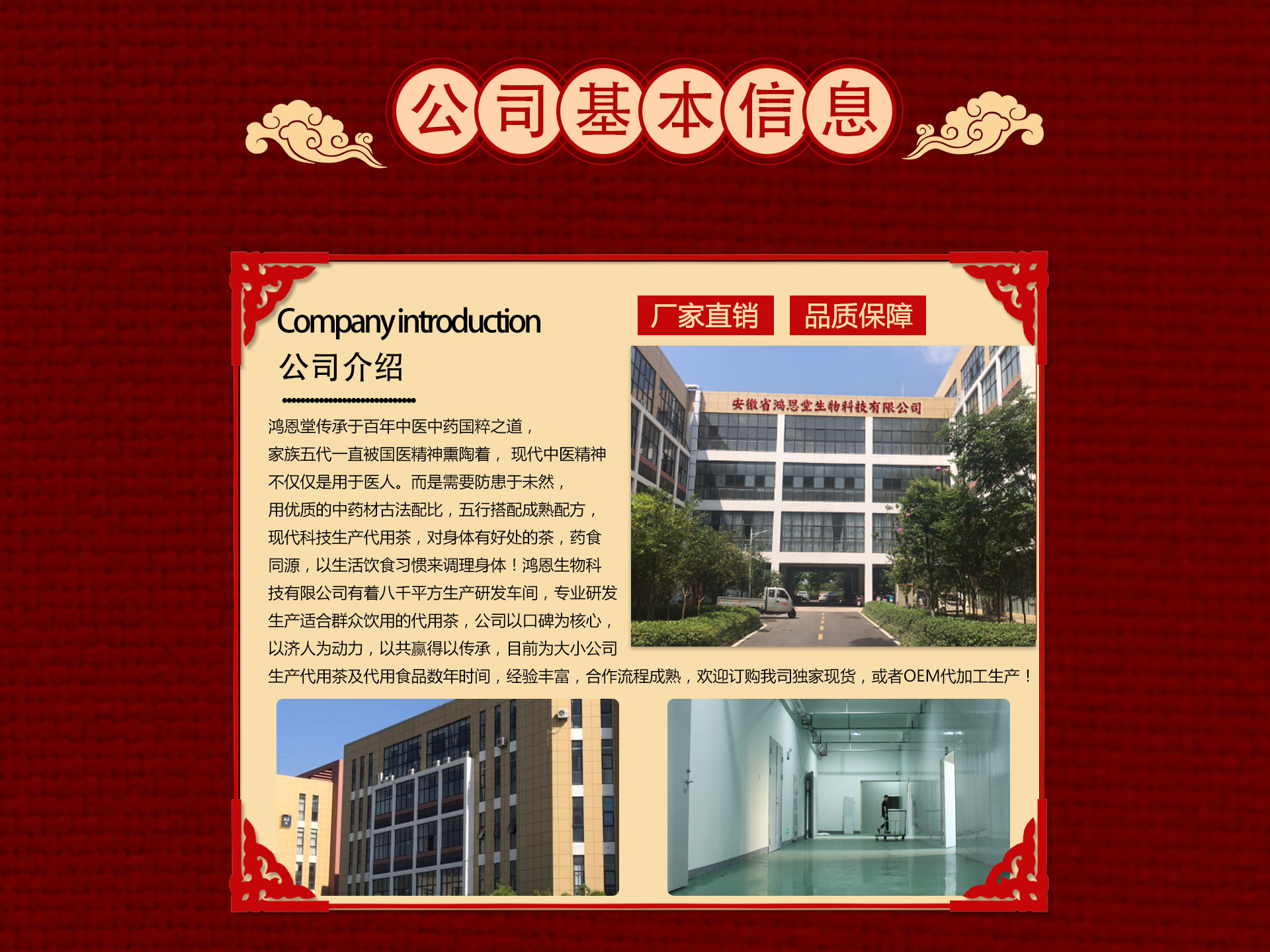 安徽省鸿恩堂生物科技有限公司,注册资金600万,新厂成立于2018年,有相应的销售服务人员,检测人员,包装工人150人,我们承诺一次相识,终身朋友!
