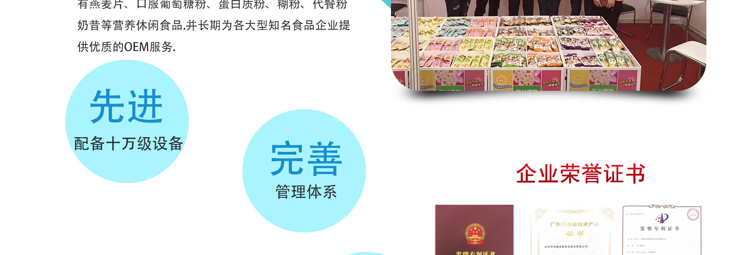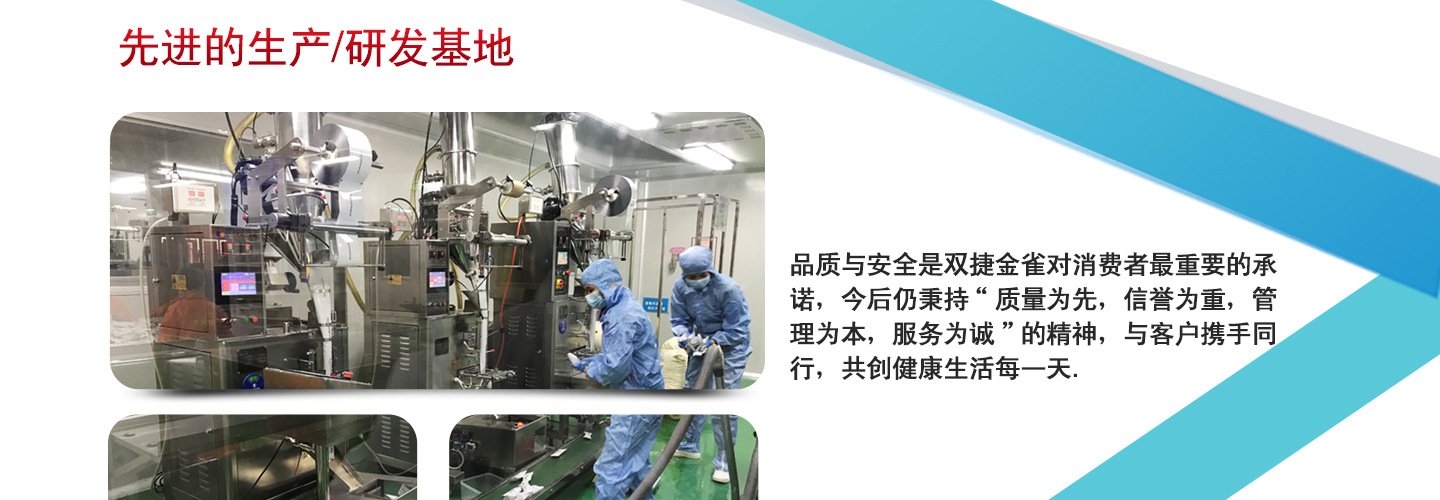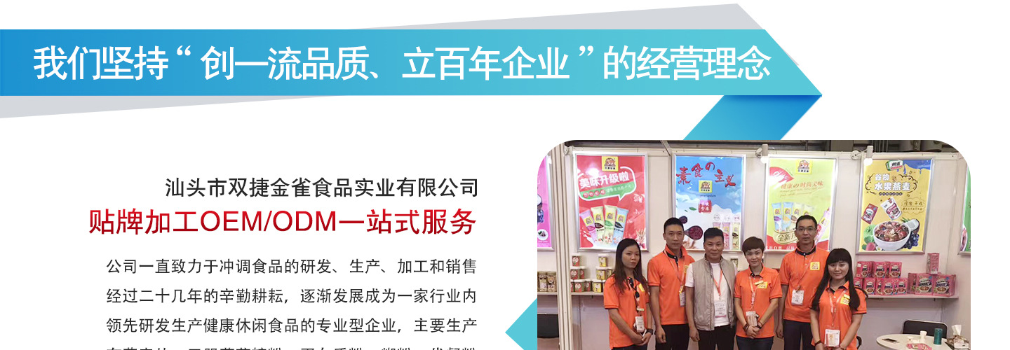 汕头市双捷金雀食品实业有限公司,坐落于素有“海滨邹鲁、美食之乡”之称的海滨城市——汕头。公司一直致力于冲调食品的研发、生产、加工和销售,经过二十几年的辛勤耕耘,逐渐发展成为一家行业内领先研发生产健康休闲食品的专业型企业,主要生产有燕麦片、口服葡萄糖粉、蛋白质粉、糊粉、代餐粉等营养休闲食品。
