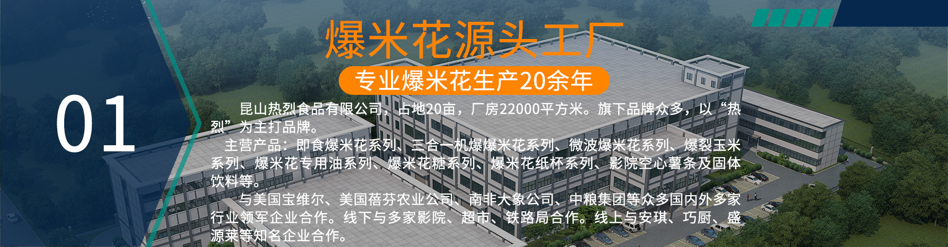 昆山热烈食品有限公司成立于2016年。由原上海昂客食品有限公司市政动迁而来。 坐落在风景秀美的江南水乡—昆山,公司占地20亩。拥有22000平方米的现代化花园厂房。 公司以“热烈”为为主打品牌。拥有7大爆米花核心产品线,是中国爆米花行业中的领先企业。 公司生产的爆米花产品线为:即食爆米花系列、三合一机爆爆米花系列、 微波爆米花系列、爆裂玉米系列、爆米花专用油系列、爆米花糖系列、爆米花纸杯系列。