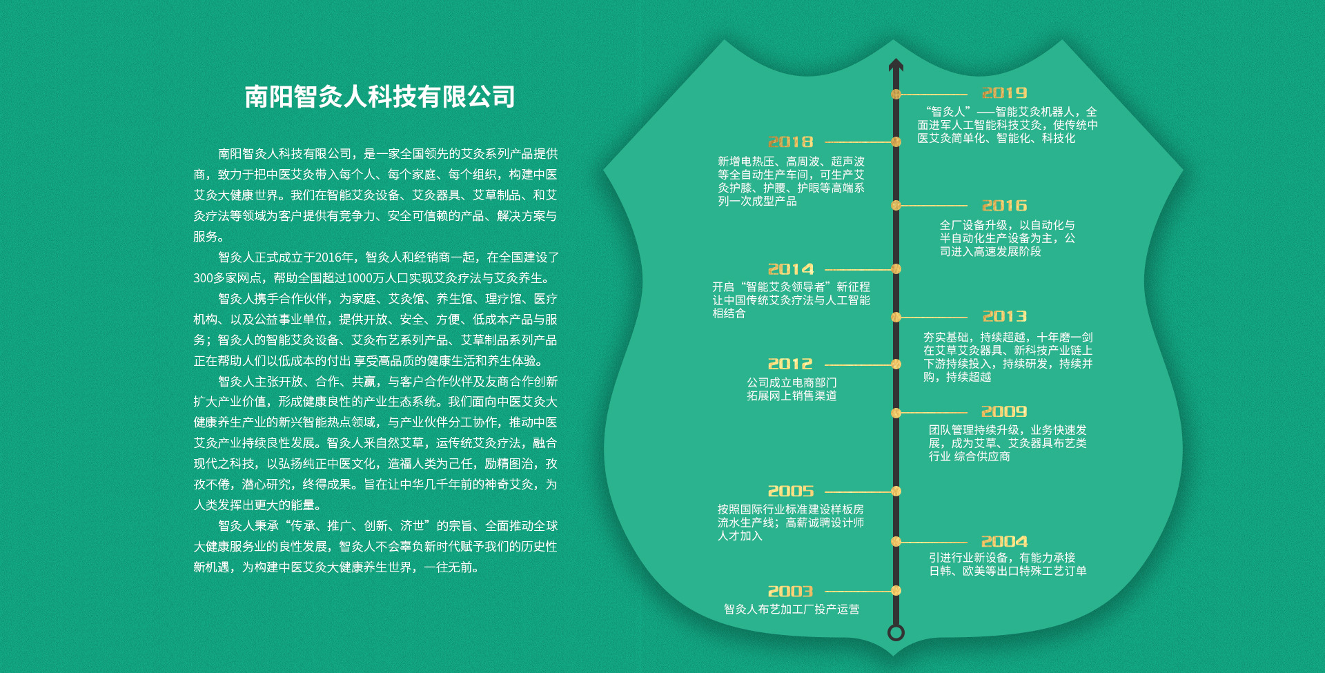 南阳智灸人科技有限公司,是一家全国领先的艾灸系列产品提供商,致力于把中医艾灸带入每个人、每个家庭、每个组织,构建中医艾灸大健康世界。我们在智能艾灸设备、艾灸器具、艾草制品、和艾灸疗法等领域为客户提供有竞争力、安全可信赖的产品、解决方案与服务。 智灸人正式成立于2016年,智灸人和经销商一起,在全国建设了300多家网点,帮助全国超过1000万人口实现艾灸疗法与艾灸养生。智灸人携手合作伙伴,为家庭、艾灸馆、养生馆、理疗馆、医疗机构、以及公益事业单位,提供开放、安全、方便、低成本的产品与服务;智灸人的智能艾灸设备、艾灸布艺系列产品、艾草制品系列产品, 正在帮助人们以低成本的付出 享受高品质的健康生活和养生体验。 智灸人主张开放、合作、共赢,与客户合作伙伴及友商合作创新、扩大产业价值,形成健康良性的产业生态系统。我们面向中医艾灸大健康养生产业的新兴智能热点领域,与产业伙伴分工协作,推动中医艾灸产业
