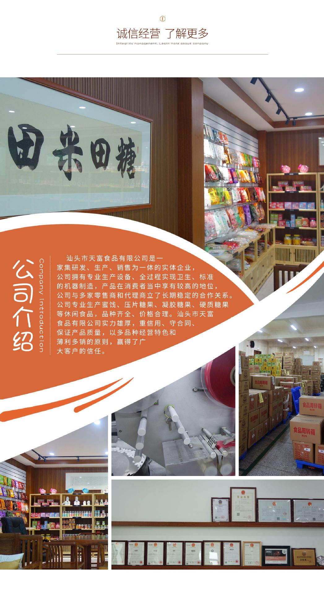 汕头市天富食品有限公司座落在气候宜人的海滨城市-汕头市。公司自 2012年开始致力于中国市场,现有的产品系列涵盖无糖薄荷压片糖、奶片 压片糖、果味硬糖、棉花糖和休闲小食等。 我司主营内销及出口,在“ ” 的品牌战略 指导下,营销网络已遍及经济发达的沿海地区和部分内陆省份,销售我们公 司产品的零售点超过千家。 目前我们已经和山姆、吉之岛、易初莲花、永辉等大型零售企业合作, 取得了理想的经营业绩,真正达到了供应商、零售商、消费者三赢的目 标。 我们一直倡导“诚信、务实、时尚、创新”的经营理念,信守“平等互利” 的经营宗旨,发挥团队协作精神,努力为广大客户提供更多具有核心竞争力 和生命力的产品,打造更加开放性的合作平台,共图发展,携手创造美好的 未来。