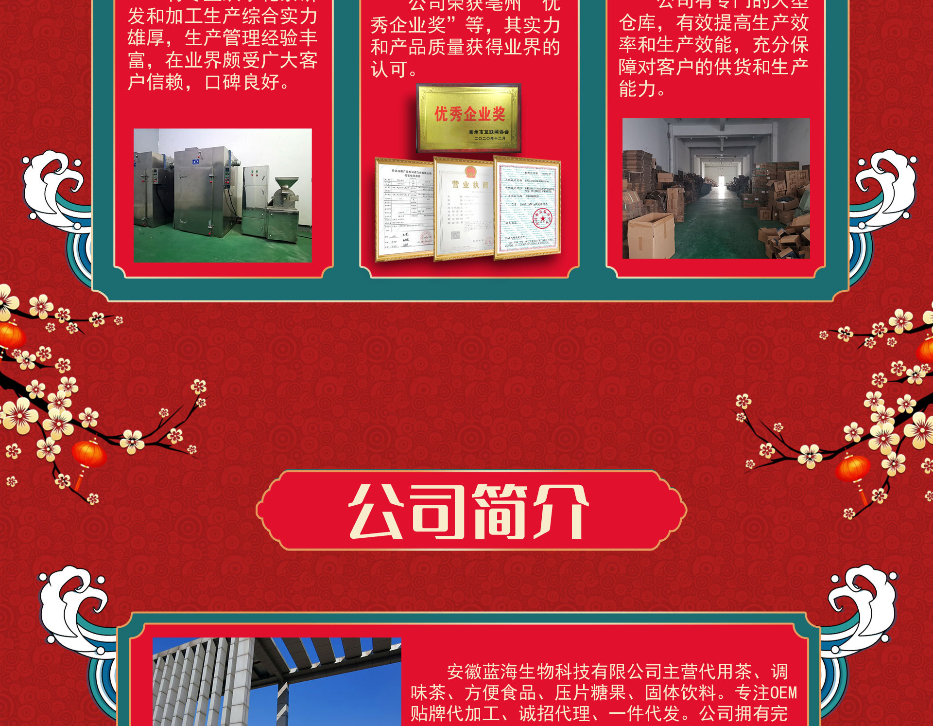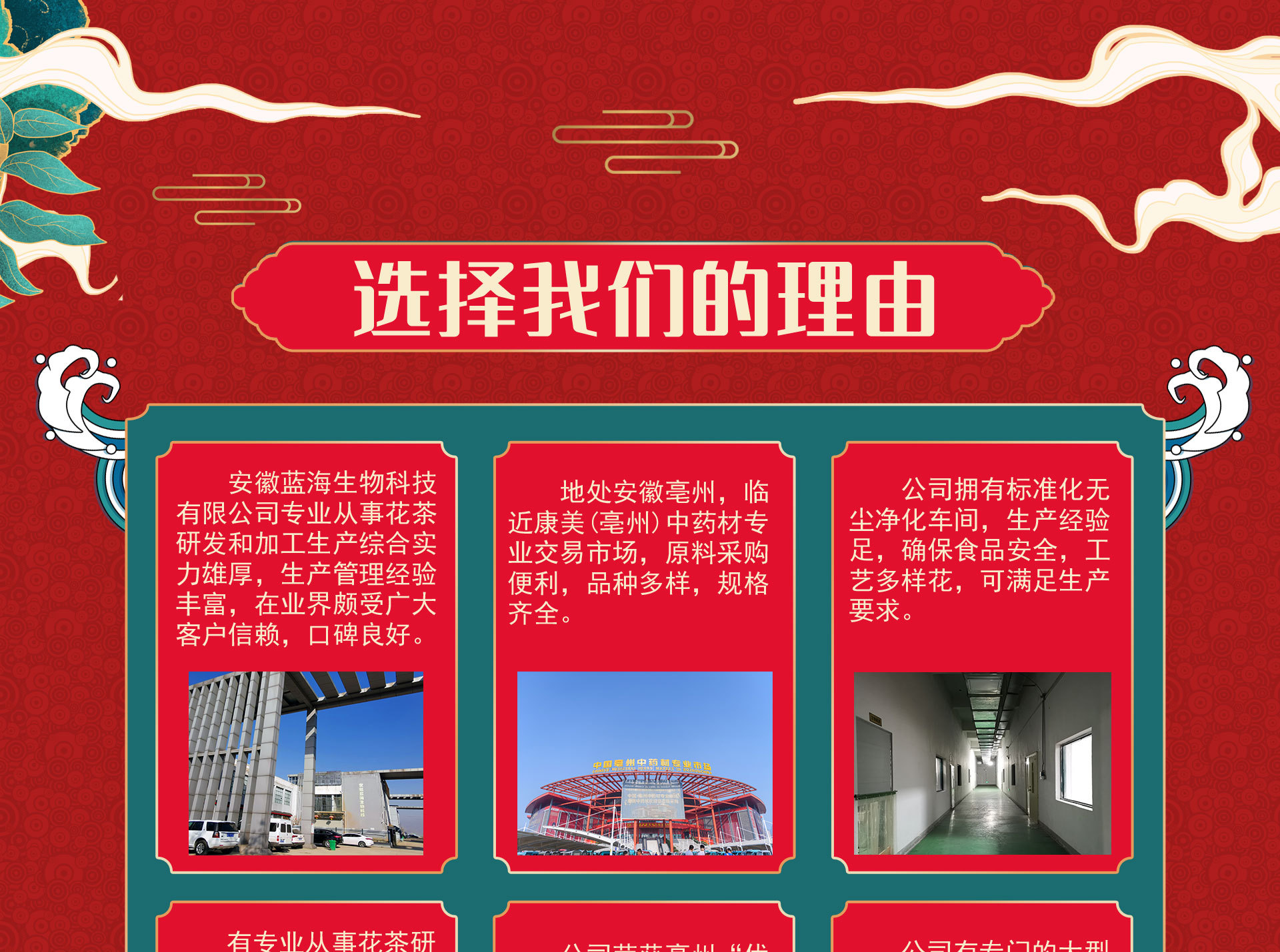 安徽蓝海生物科技有限公司坐落于安徽亳州市互联网创业示范园,本公司是一家致力于集科研开发、产品生产、物流配送、市场销售为一体的,服务于全国客户的公司。涵盖中国大部分省市及地区,采用店面销售、会议销售、网络销售、经销商分销等多种模式进行销售。安徽蓝海生物科技有限公司是芝麻丸、花茶、膏滋等产品专业生产加工的公司,拥有完整、科学的质量管理体系。安徽蓝海生物科技有限公司的诚信、实力和产品质量获得业界的认可,欢迎各界朋友莅临参观、指导和业务洽谈。
