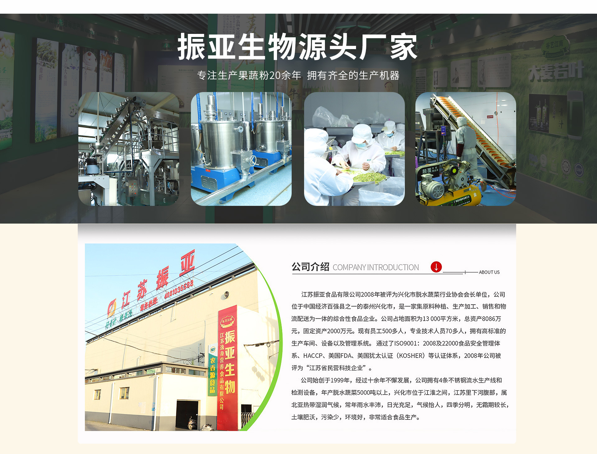 江苏振亚生物科技有限公司2008年被评为兴化市脱水蔬菜行业协会会长单位,公司 位于中国经济百强县之一的泰州兴化市,是一家集原料种植、生产加工、销售和物流配送为一体的综合性食品企业。公司占地面积为13 000平方米,总资产8086万元,固定资产2000万元。现有员工500多人,专业技术人员70多人,拥有高标准的生产车间、设备以及管理系统。 公司是“江苏省省级出口农产品示范基地”,并通过了ISO9001:2008及22000食品安全等认证体系,2008年公司被评为“江苏省民营科技企业”。 公司始创于1999年,经过十余年不懈发展,公司拥有4条全国领先的全套不锈钢流水生产线和检测设备,年产脱水蔬菜5000吨以上,兴化市位于江淮之间,江苏里下河腹部,属北亚热带湿润气候,常年雨水丰沛,日光充足,气候怡人,四季分明,无霜期较长,土壤肥沃,是全国有名的农业大市,由于工业发展相对落后,污染少,环境好,非