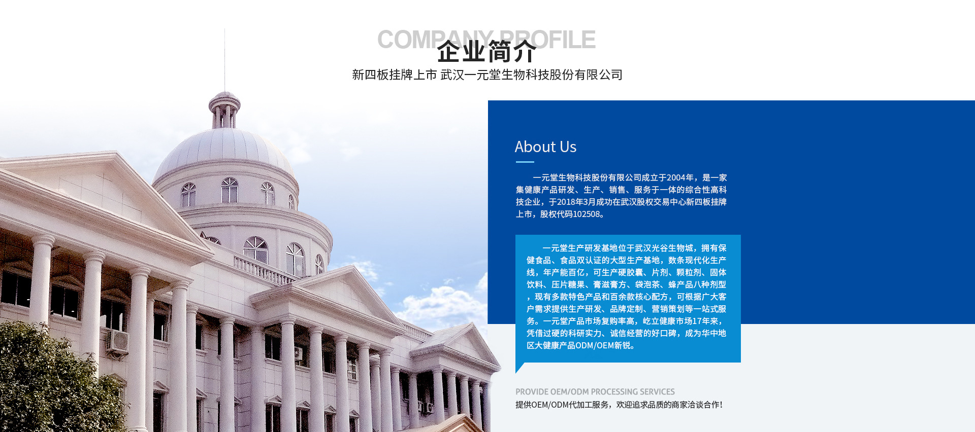 武汉一元堂生物科技股份有限公司成立于2004年,拥有硬胶囊、片剂、颗粒剂、固体饮料、压片糖果、膏滋膏方、袋泡茶、蜂产品等八类剂型生产线,保健食品、食品两大产品系列。同时,我们拥有多款特色产品和百余款成熟配方,致力于为广大客户提供生产研发、品牌定制、营销策划等一站式服务。生产中心拥有完整、科学的质量管理体系,诚信、实力和产品质量获得业界的认可,热烈欢迎各界朋友莅临公司指导、参观、洽谈业务