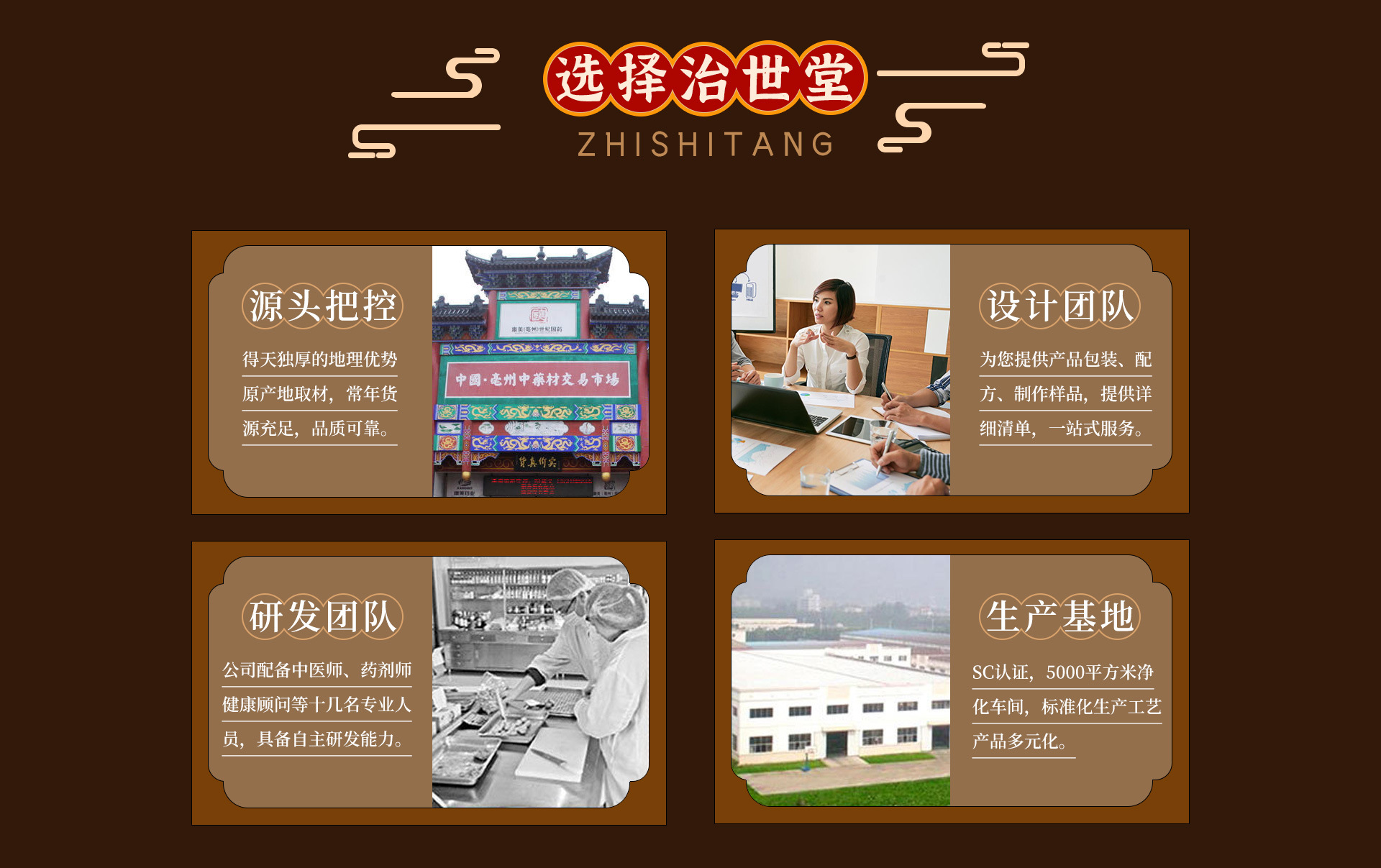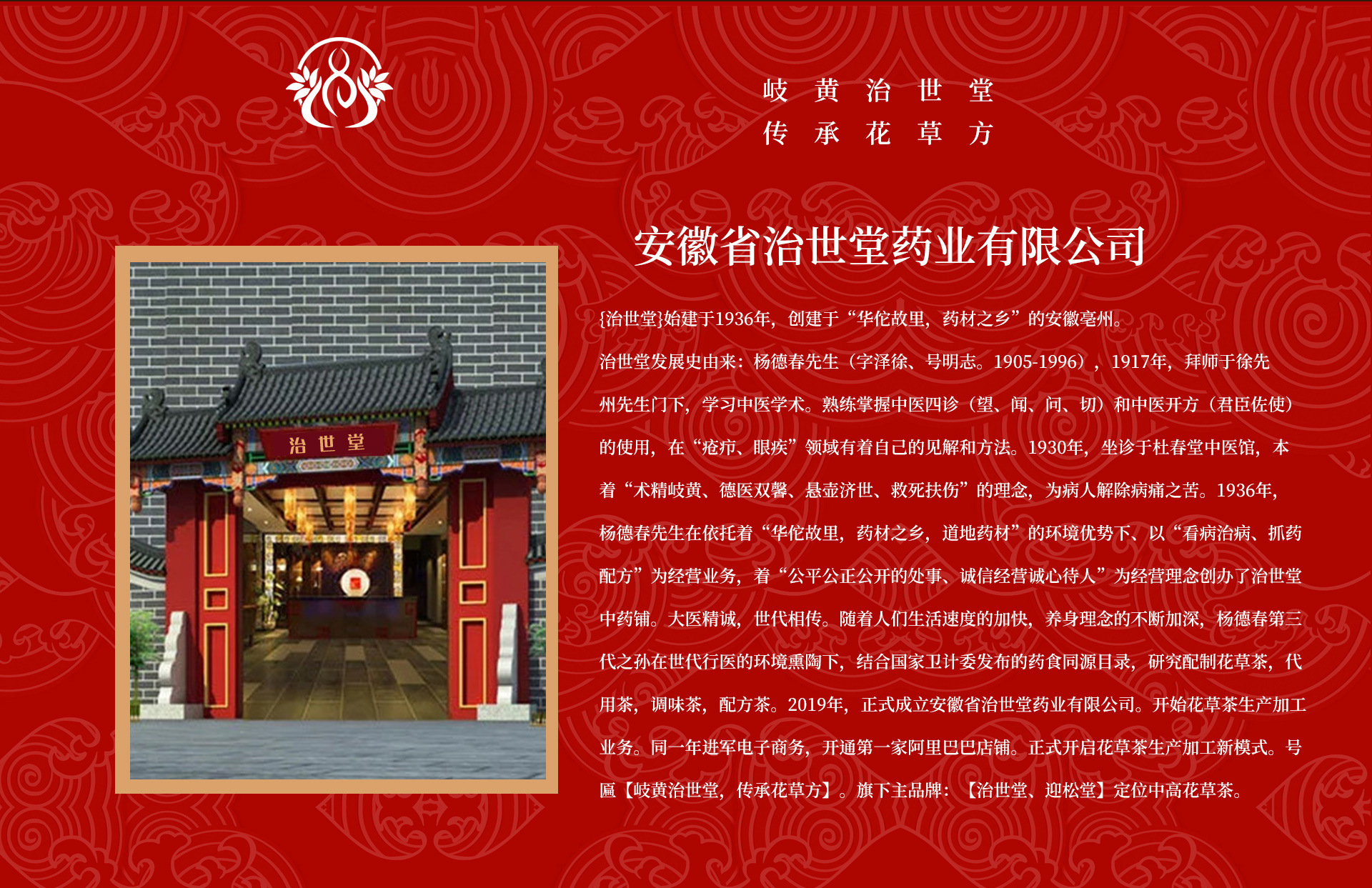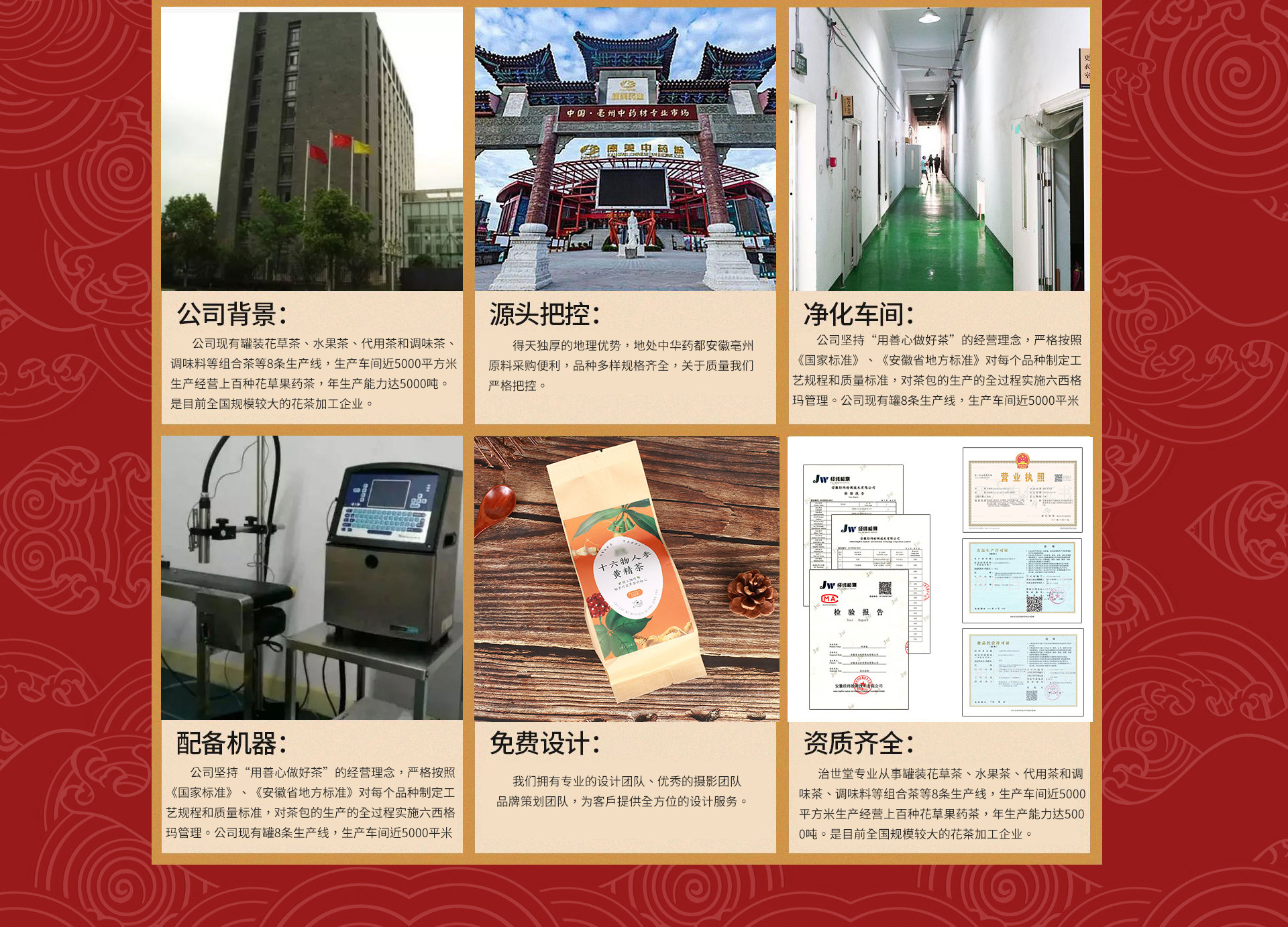 安徽省治世堂药业有限公司坐落于中国最大的药材集散地神医华佗的故乡和中医药文化的发祥地之一亳州,素有"中华药都之称"。本公司专业生产花草茶,水果茶,调味茶、固体饮料、方便食品的源头厂家,专业代加工生产、OEM贴牌生产、一件代发、网红直播带货、摆摊拿货、支持微商,淘宝,京东,拼多多分销、线下实体商超铺货以及批发,零售。公司有有专业的产品研发团队,拥有2000平方的专业厂房面积。长期员工人数达到150人左右。有配套的物流链,发货方便。