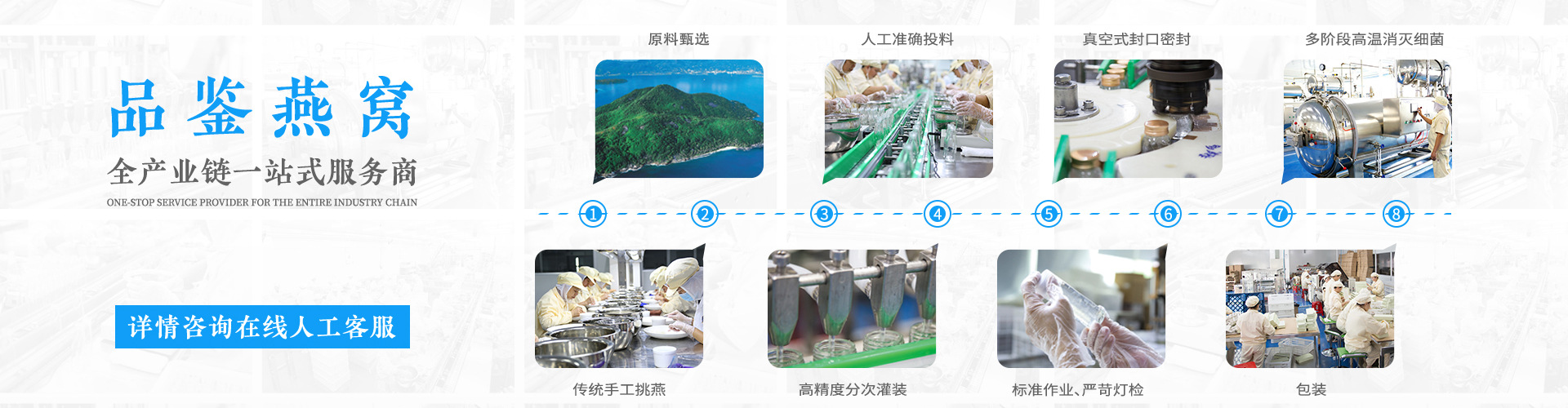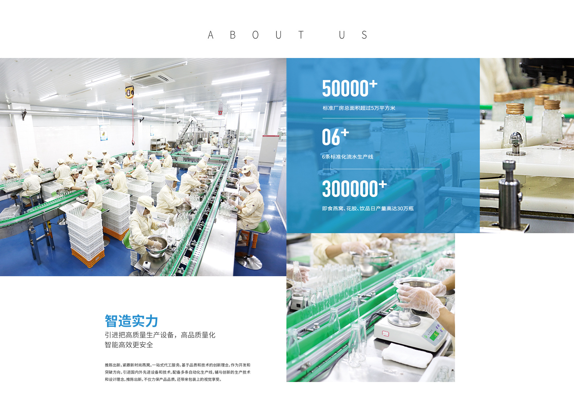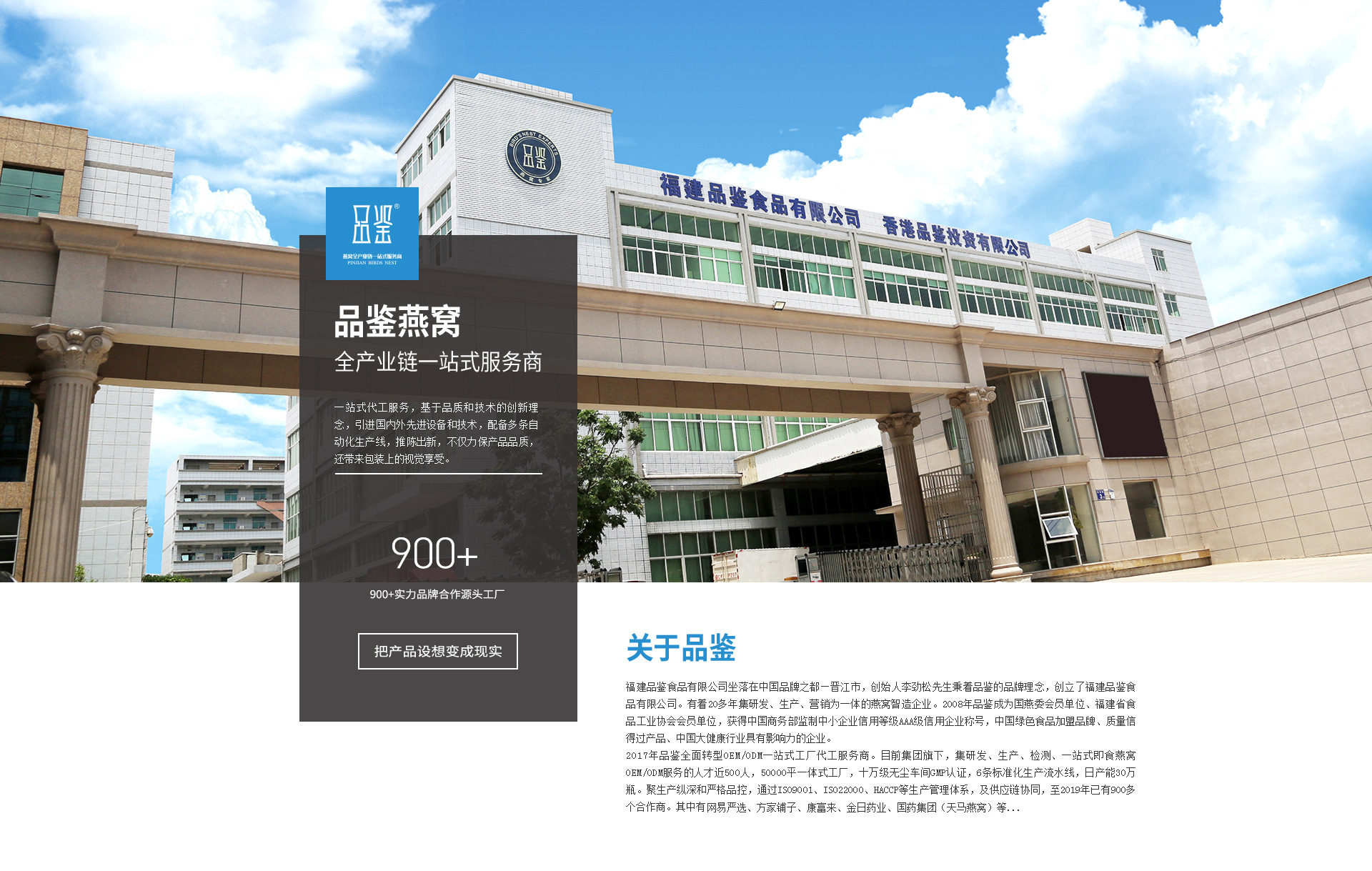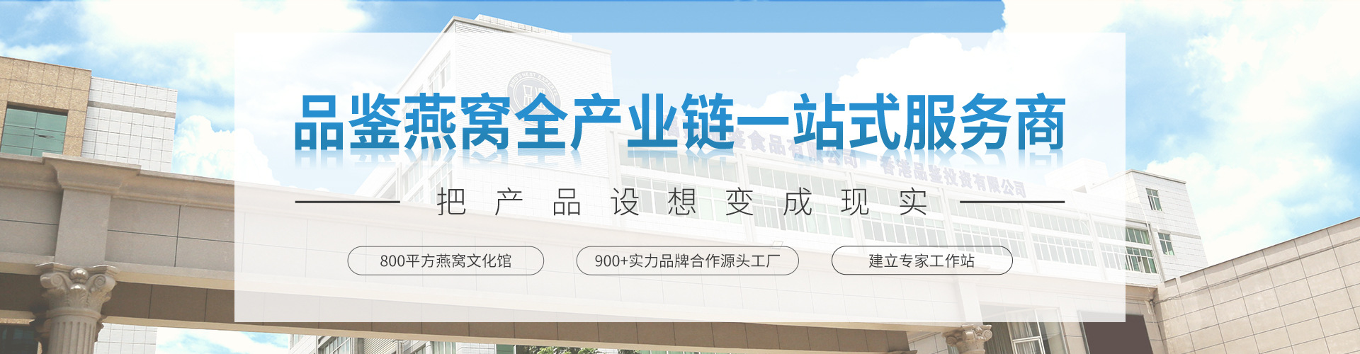 福建品鉴食品有限公司坐落在晋江市,有着20多年集研发、生产、营销为一体的专业燕窝智造企业。燕委会员单位、福建省食品工业协会会员单位,获得中国商务部监制中小企业信用等级AAA级信用企业称号,中国绿色食品加盟品牌、质量信得过产品、中国大健康行业最具影响力领先企业。目前集团旗下,集研发、生产、检测、一站式即食燕窝OEM/ODM服务的专业人才近500人,50000平智能化工厂,高洁净无尘车间,6条标准化生产流水线,日产能30万瓶。严格品质管控精益求精,通过ISO9001、ISO22000、HACCP等生产管理体系,及供应链协同,至2020年上半年已有900多个品牌合作商。其中有东阿阿胶(燕奴娇)、TST、钓鱼台(钓小燕)、小米有品、网易严选、余仁生、宜样新滋补、南京同仁堂、韩成兴、华润堂、康富来、金日药业、国药集团(天马燕窝)金都燕...