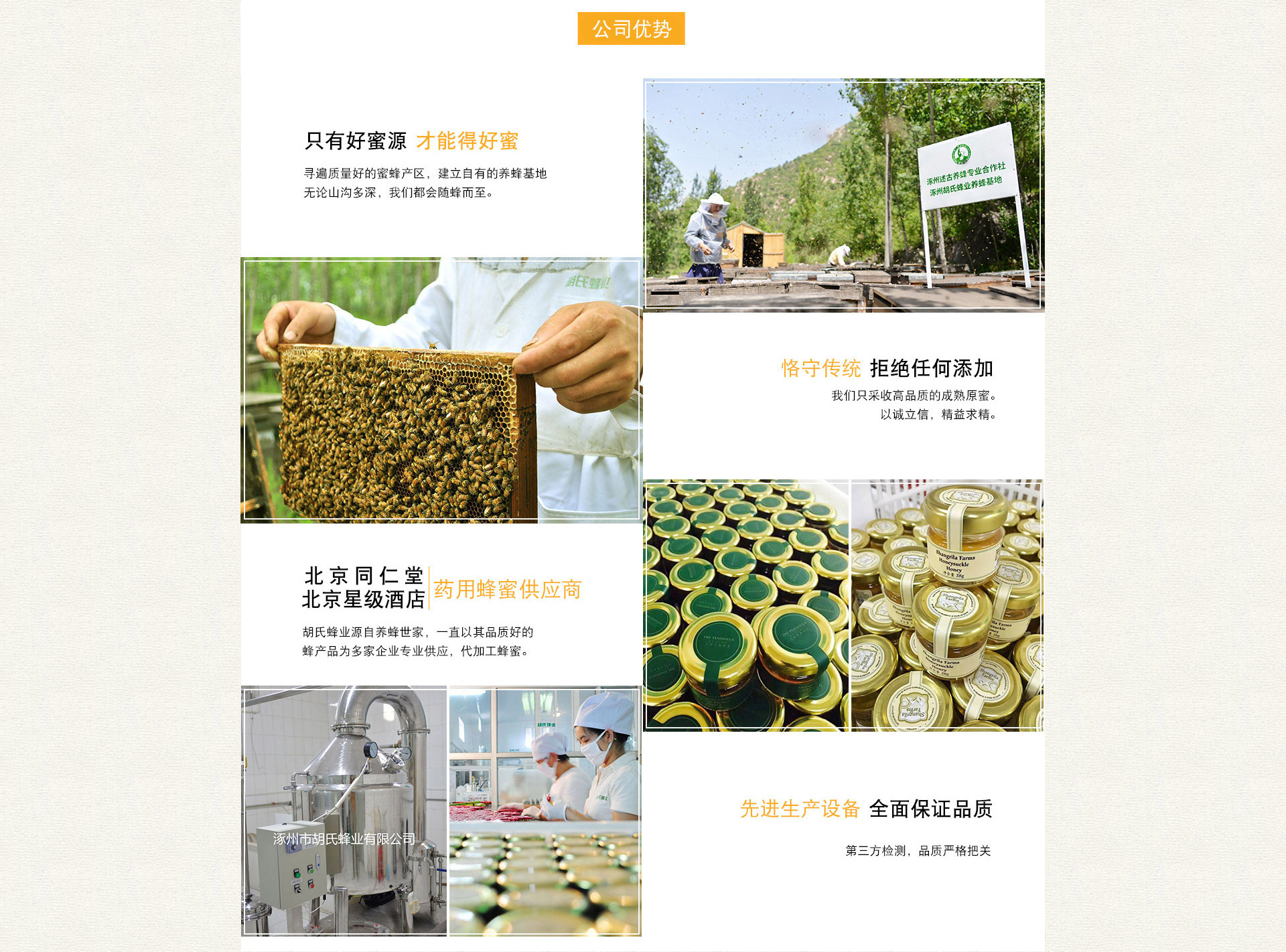 涿州市胡氏蜂业有限公司毗邻北京,源自养蜂世家,由我国养蜂先驱胡述古先生创立于1920年,已有百年历史,凭借四代传承的养蜂取蜜技艺入选非物质文化遗产保护单位,并被评选为“燕赵老字号品牌”。胡氏蜂业不仅是农业产业化龙头企业,并且拥有专属养蜂合作社,并被评为农业专业合作社示范社。 作为专业高品质蜂蜜供应商,胡氏蜂业一直恪守传统、拒绝添加,坚持采收高浓度的成熟原蜜,并创新低温过滤工艺,使其蜂蜜具有更多活性营养和浓郁花香,品质出众。胡氏蜂业创新推出的婚礼蜂蜜带动了国内喜蜜流行风潮,并被CCTV、BTV、《新娘杂志》等众多媒体报道推荐。 胡氏蜂业产品规格、品类丰富,拥有自主品牌和直营专卖店,并为经销商提供批发、代发、定制合作,同时为众多知名厂商和品牌提供原料蜂蜜及OEM代加工服务,并得到合作伙伴一致信赖。胡氏蜂业愿与社会各界携手共进,打造百年优质品牌!欢迎来电咨询、入厂参观,洽谈合作!